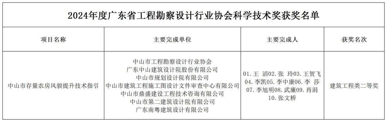 其中,本協(xié)會(huì)聯(lián)合廣東中山建筑設(shè)計(jì)院股份有限公司、中山市規(guī)劃設(shè)計(jì)院有限公司、中山市建筑工程施工圖設(shè)計(jì)文件審查中心有限公司、中山市鼎盛建設(shè)工程技術(shù)咨詢(xún)有限公司、中山市第二建筑設(shè)計(jì)院有限公司、廣東南粵建筑設(shè)計(jì)有限公司等多家單位完成的《中山市存量農(nóng)房風(fēng)貌提升技術(shù)指引》項(xiàng)目榮獲省設(shè)協(xié)科學(xué)技術(shù)獎(jiǎng)建筑工程類(lèi)二等獎(jiǎng)。