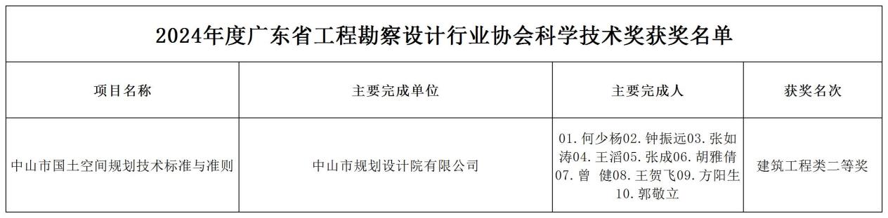 中山市規(guī)劃設(shè)計(jì)院有限公司獨(dú)立完成的《中山市國(guó)土空間規(guī)劃技術(shù)標(biāo)準(zhǔn)與準(zhǔn)則》項(xiàng)目榮獲省設(shè)協(xié)科學(xué)技術(shù)獎(jiǎng)建筑工程類(lèi)二等獎(jiǎng)。