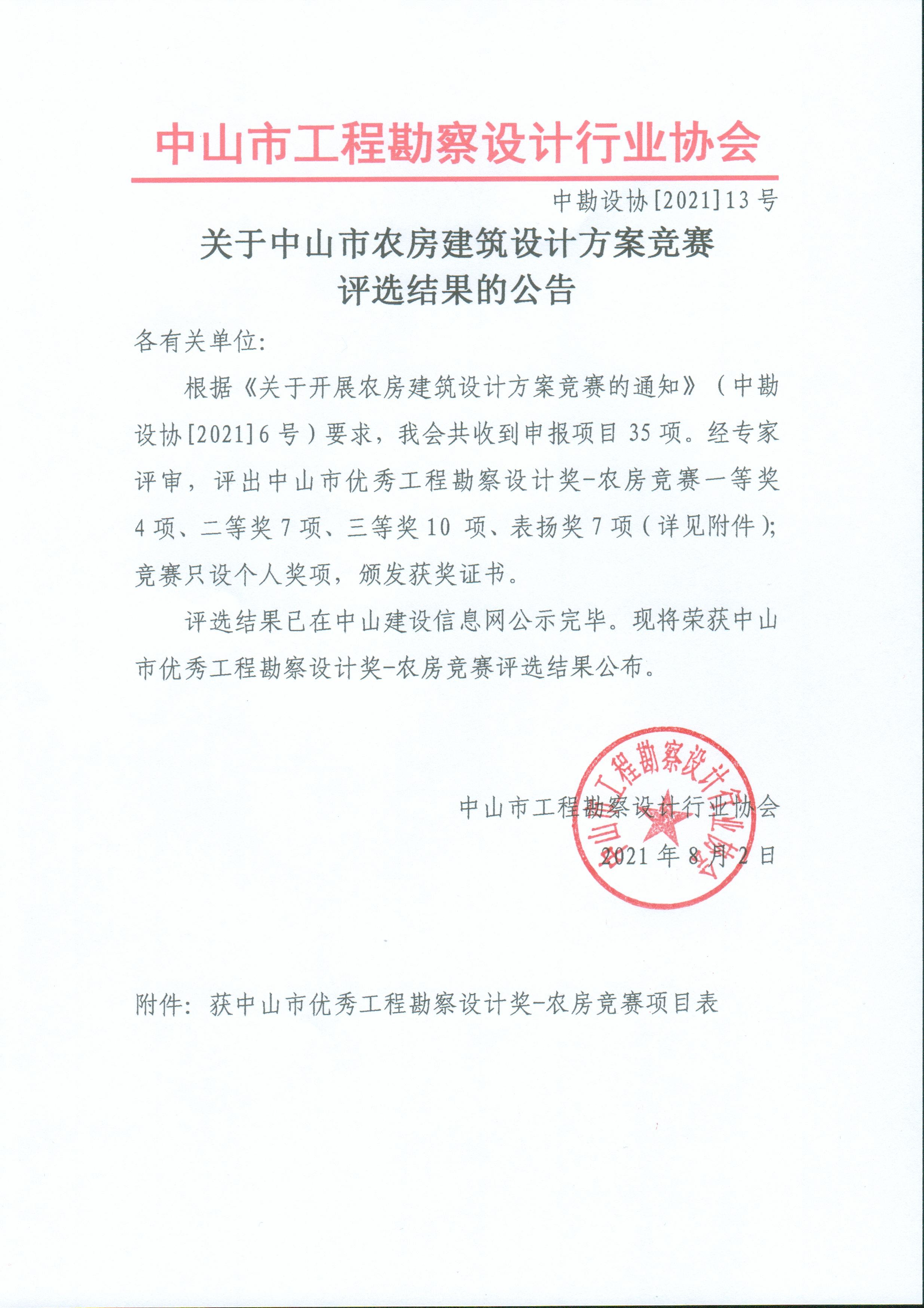 關(guān)于中山市農(nóng)房建筑設(shè)計(jì)方案競(jìng)賽評(píng)選結(jié)果的公告