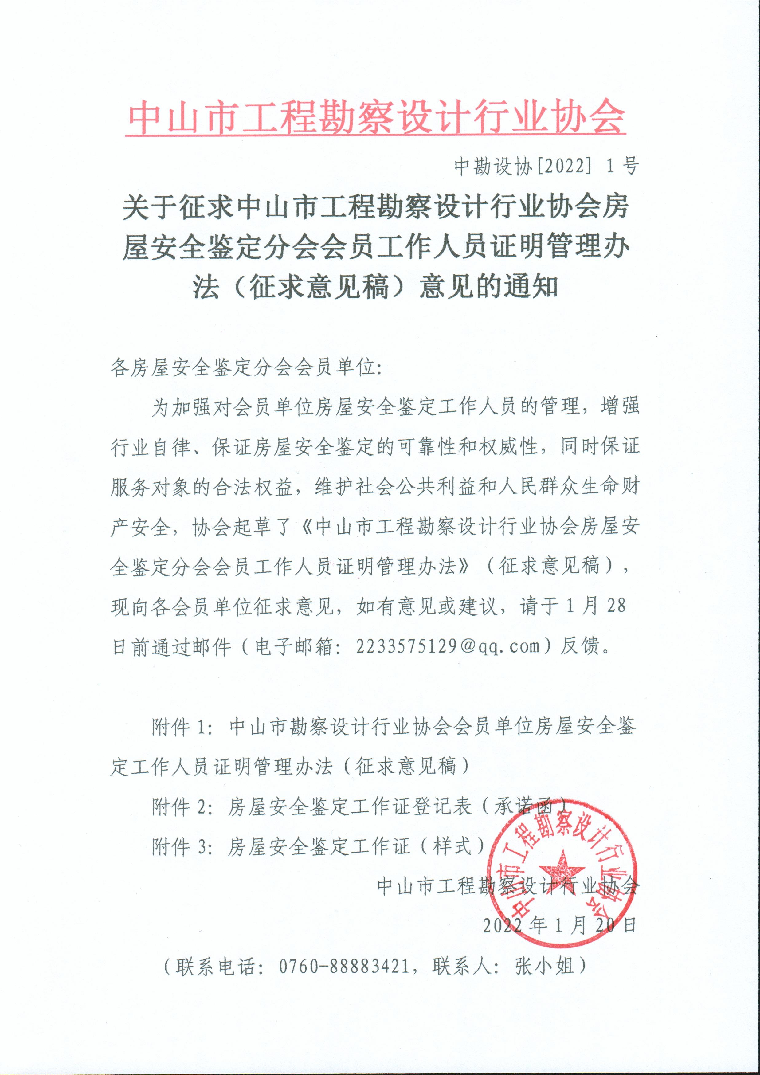關于征求中山市工程勘察設計行業(yè)協(xié)會房屋安全鑒定分會會員工作人員證明管理辦法意見的通知