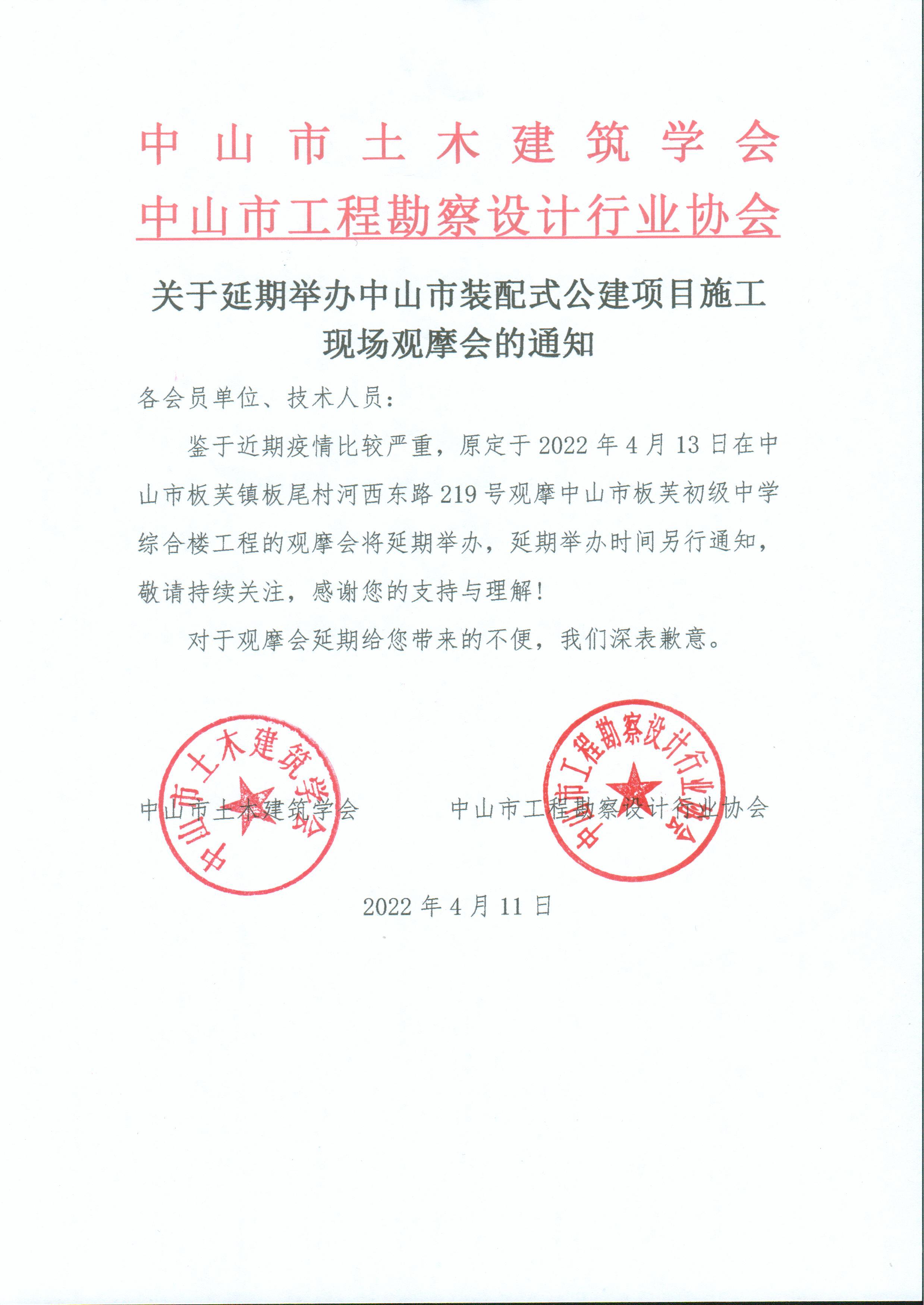 關(guān)于延期舉辦中山市裝配式公建項目施工現(xiàn)場觀摩會的通知