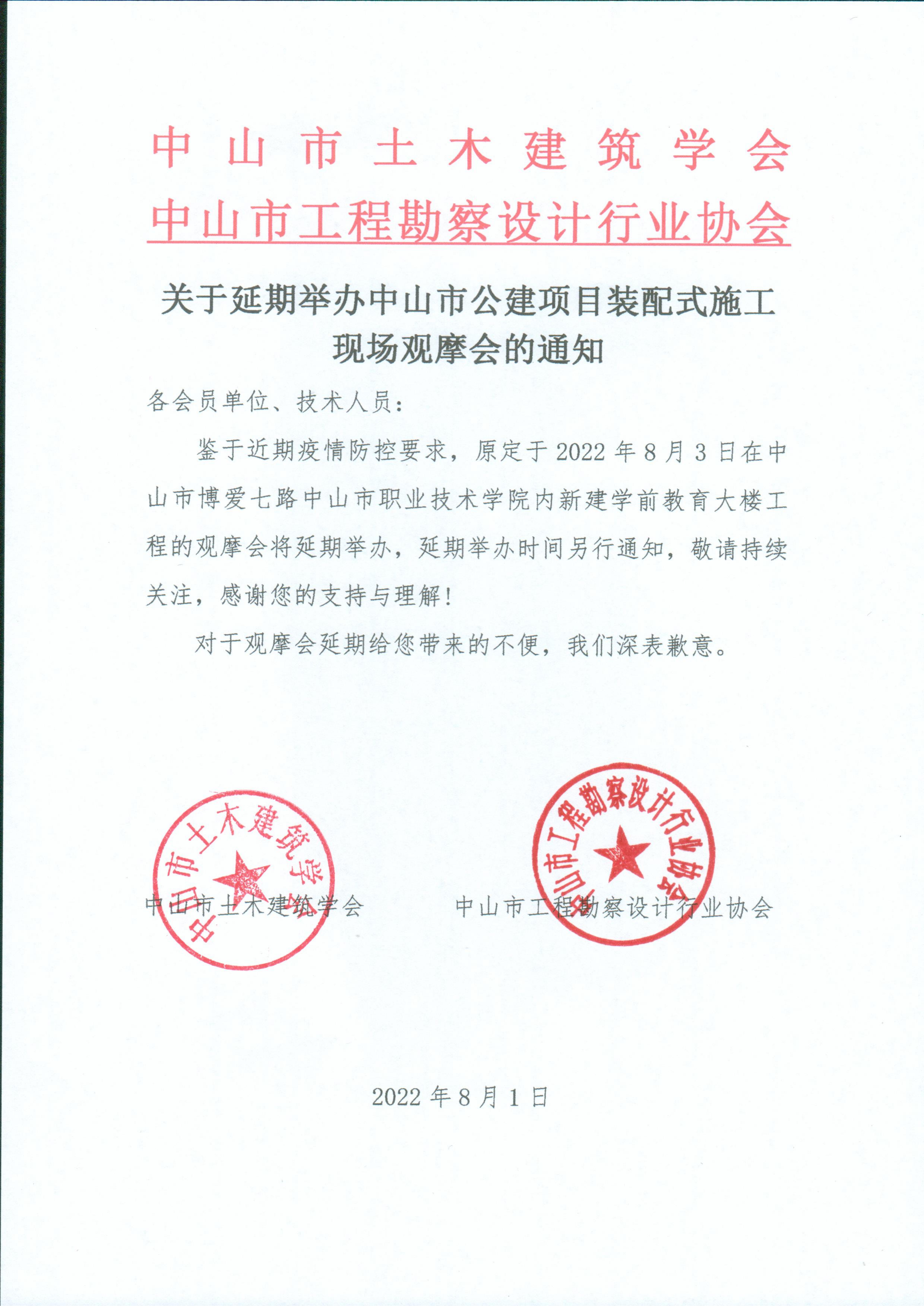 關(guān)于延期舉辦中山市公建項(xiàng)目裝配式施工現(xiàn)場(chǎng)觀摩會(huì)的通知