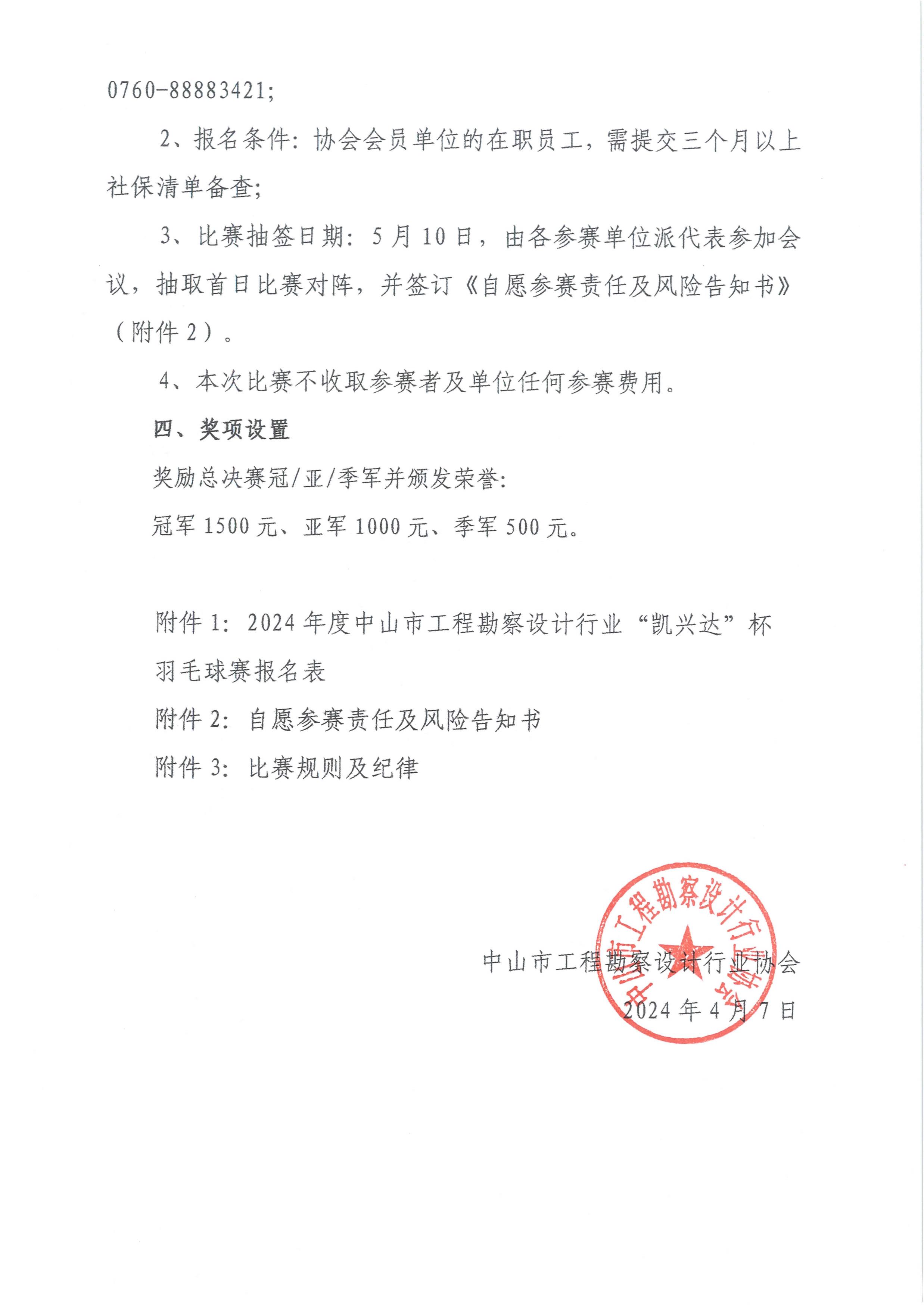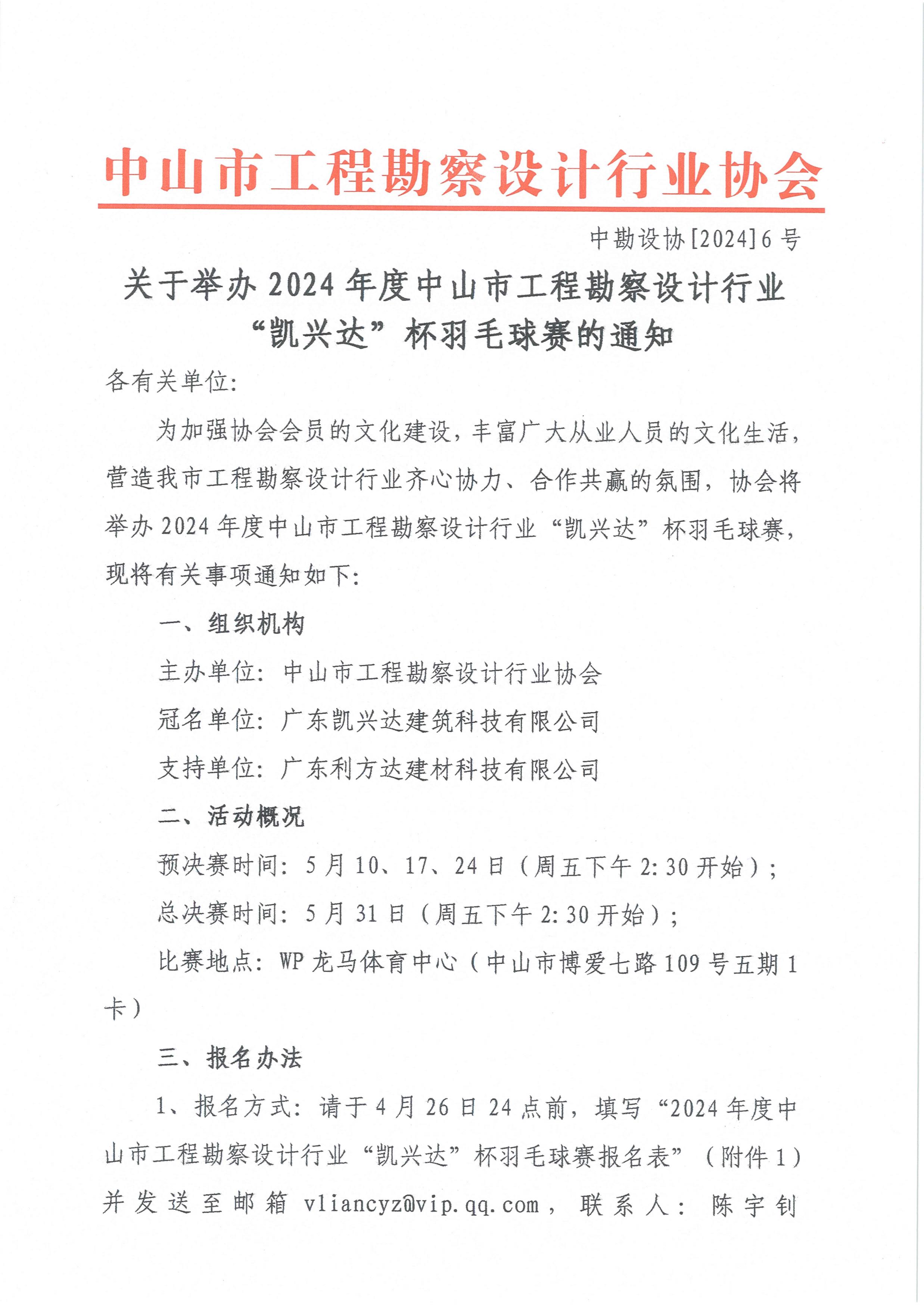 關(guān)于舉辦2024年度中山市工程勘察設(shè)計行業(yè)“凱興達(dá)”杯羽毛球賽的通知