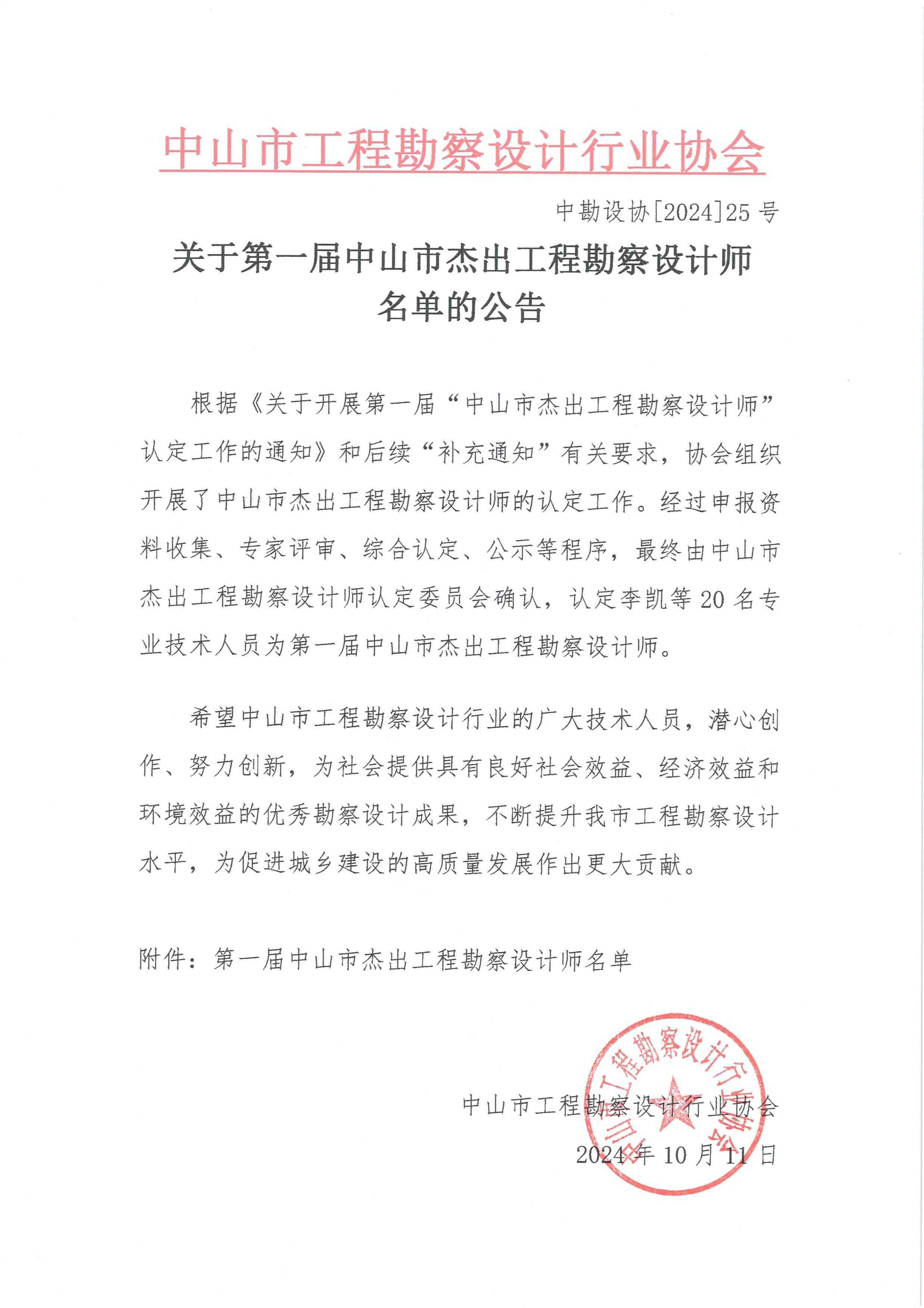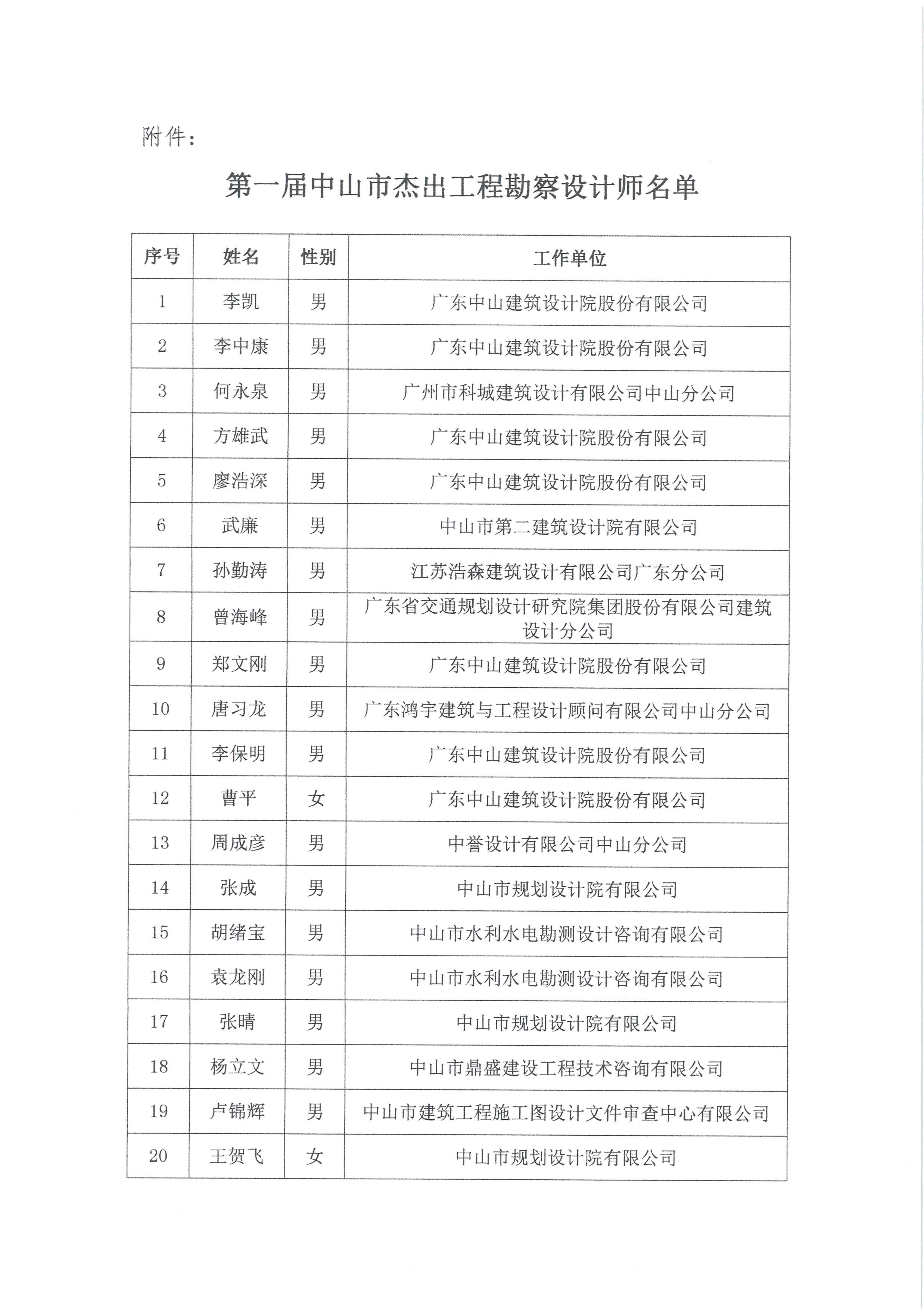 關(guān)于第一屆中山市杰出工程勘察設(shè)計師名單的公告