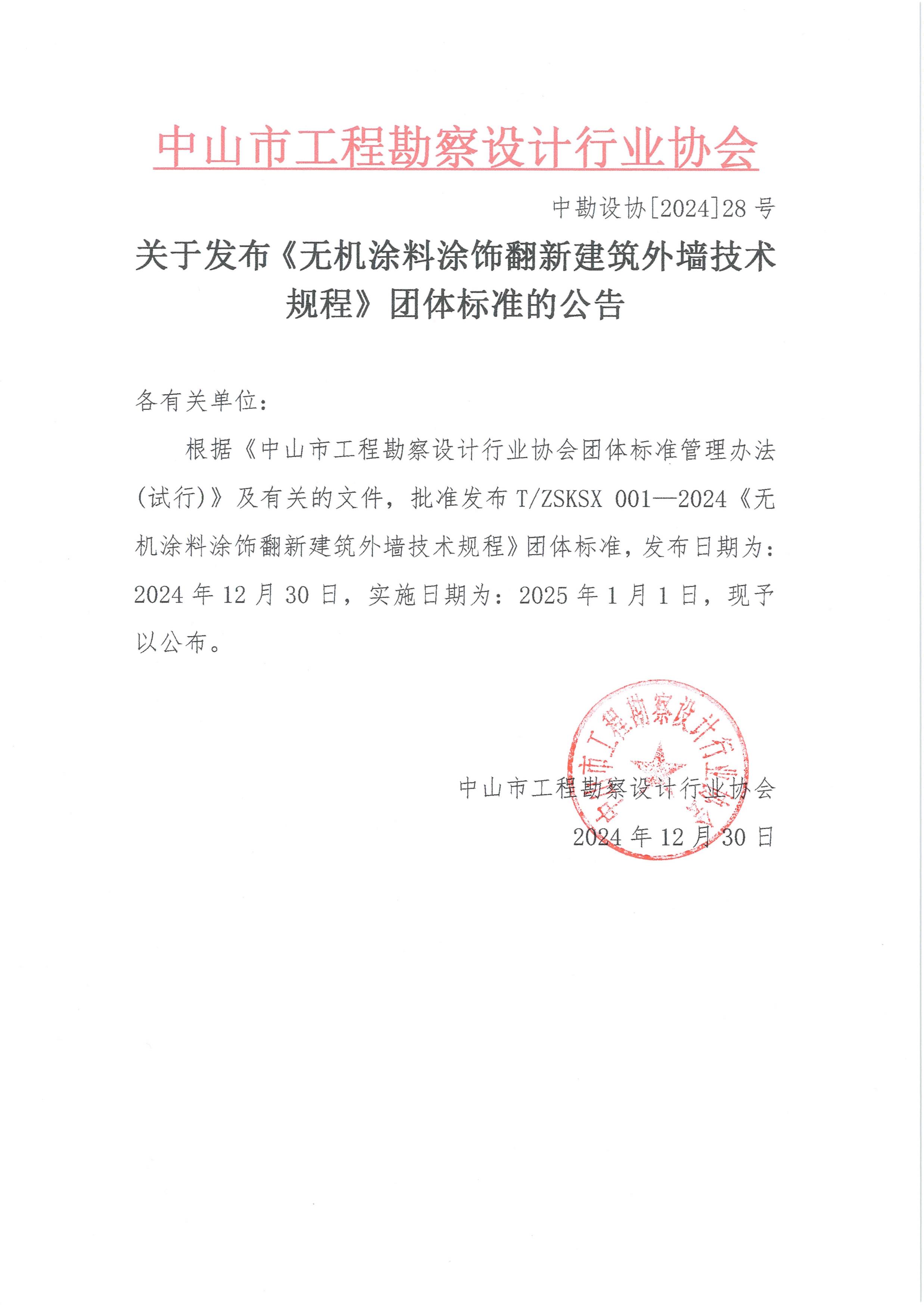 關(guān)于發(fā)布《無機(jī)涂料涂飾翻新建筑外墻技術(shù)規(guī)程》團(tuán)體標(biāo)準(zhǔn)的公告