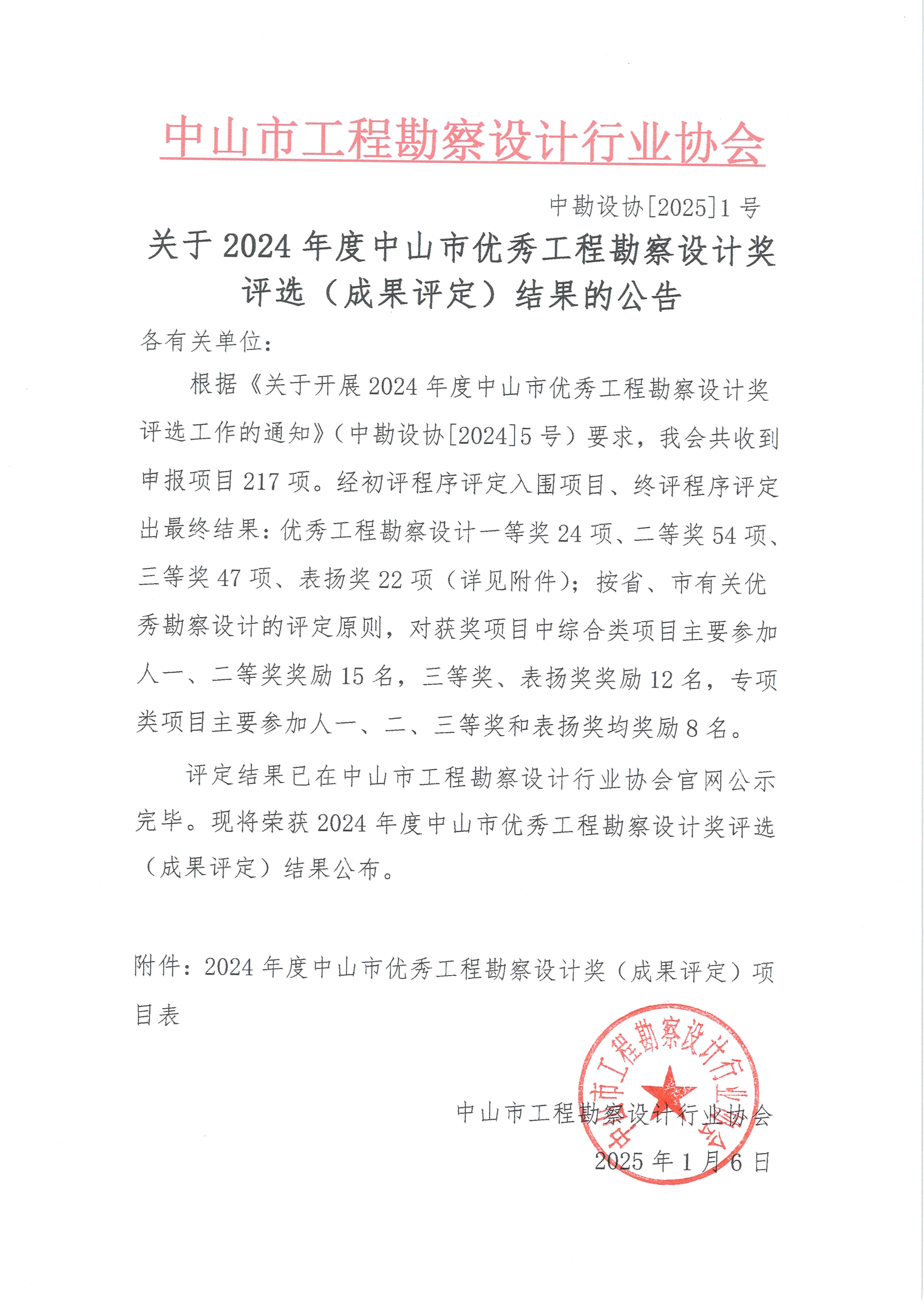 關(guān)于2024年度中山市優(yōu)秀工程勘察設(shè)計獎評選(成果評定)結(jié)果的公告